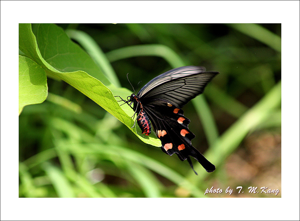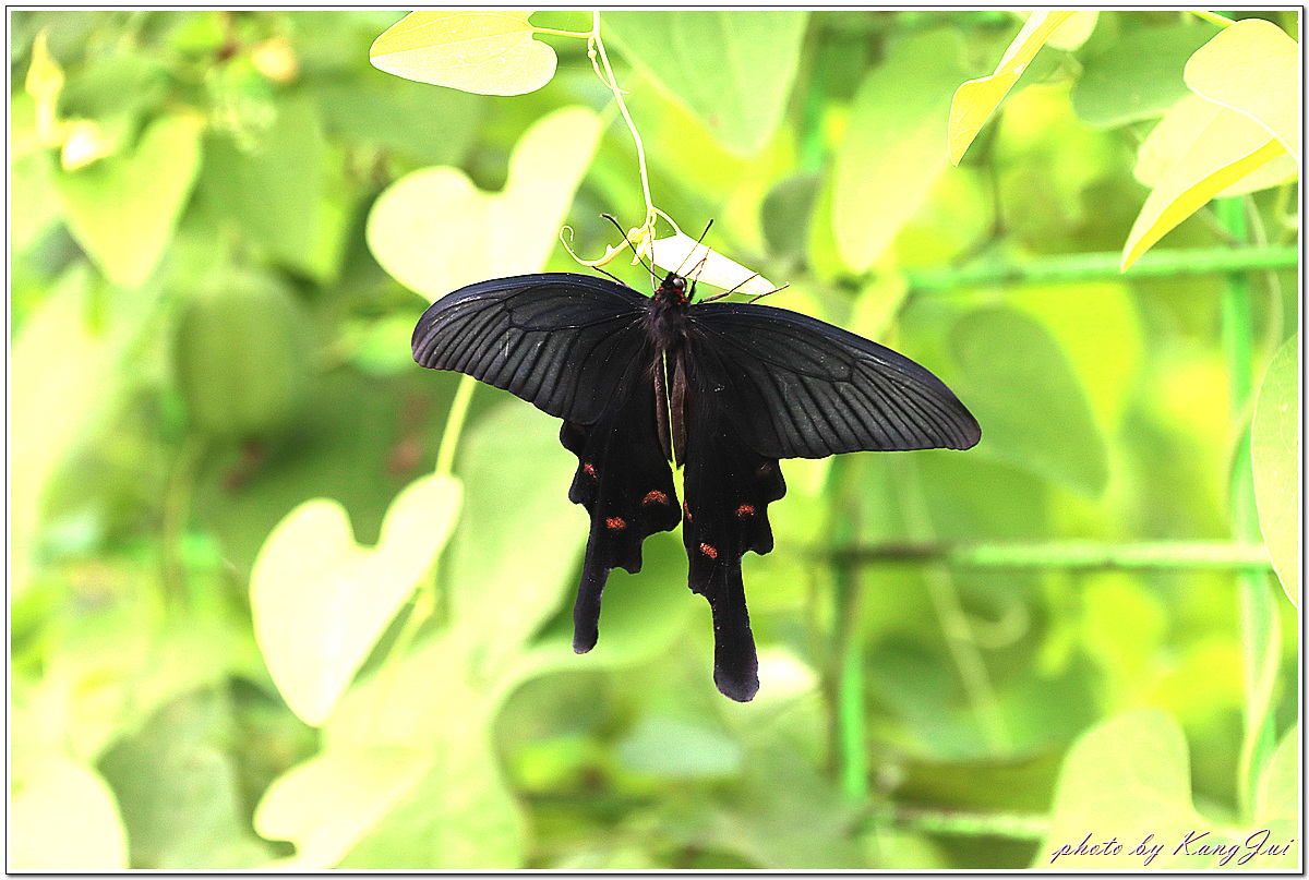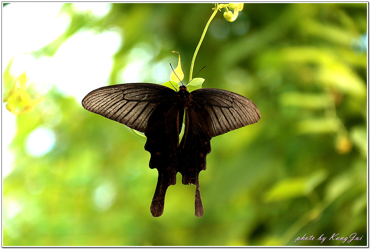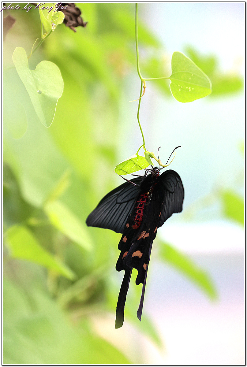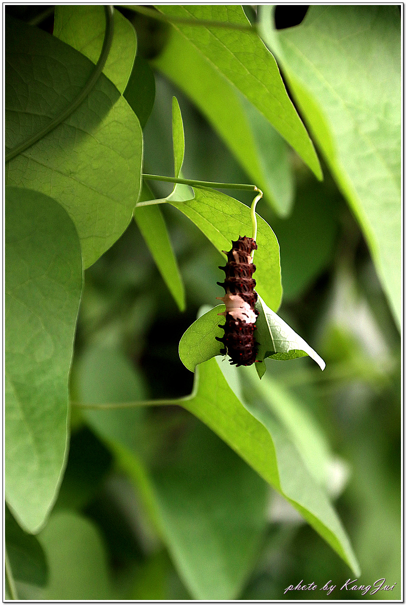긴꼬리제비나비와 흡사하나 가슴과 배의 측면에 붉은 털이 나 있어 쉽게 구별되며 등칡잎을 먹고 산다.