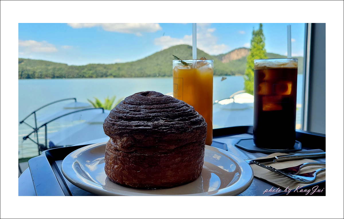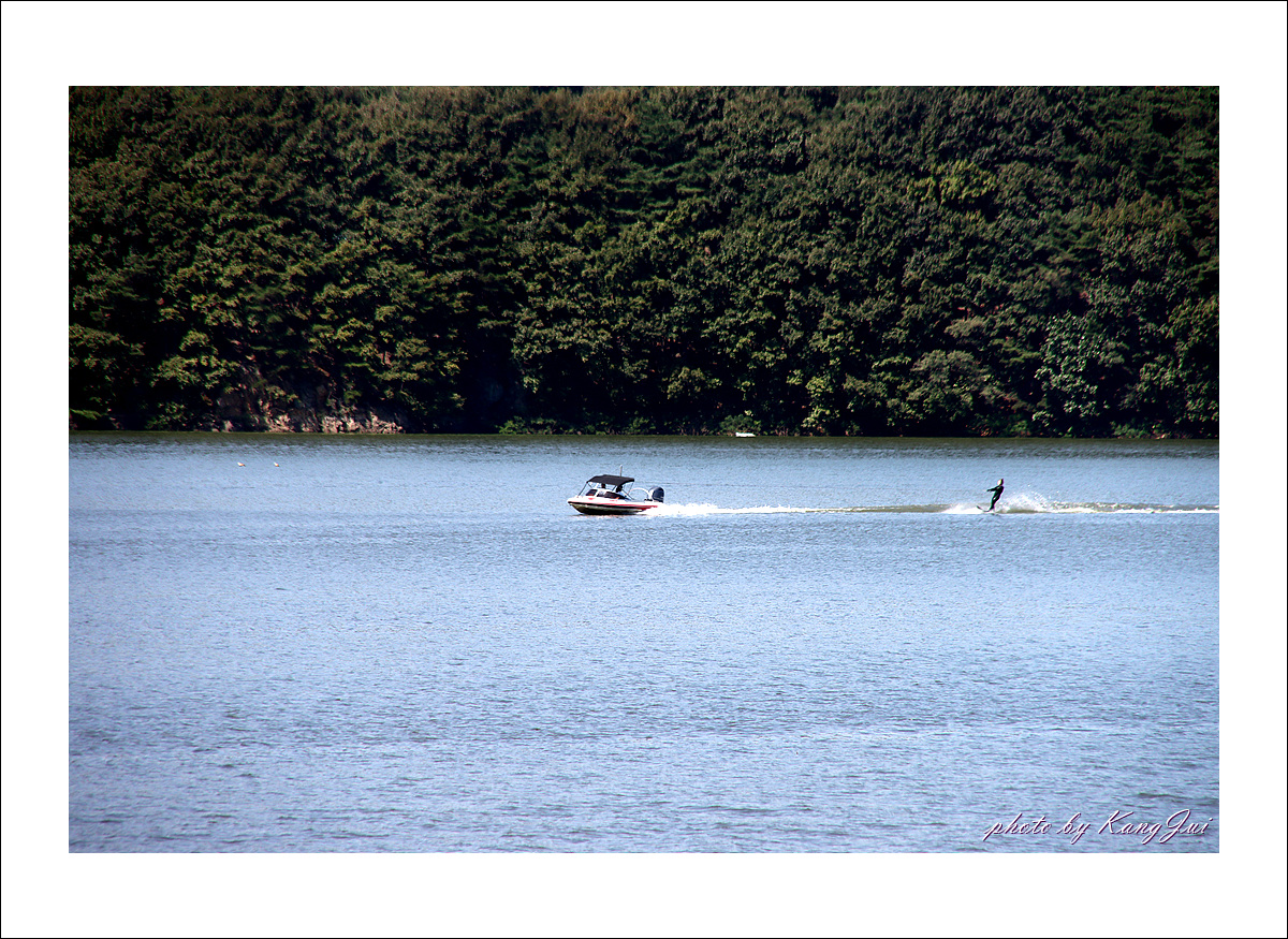 커피와 빵 한 개 주문하여 한가로이 호수에서 수상스키 즐기는 이들을 바라보았다.