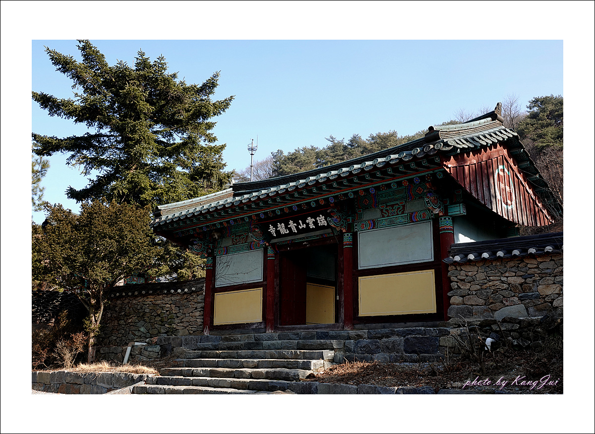 청룡사 대웅전 青龍寺 大雄殿 보물 서운산에 있는 청룡사는 고려 원종 6년(1265) 명본대사(明本大師)가 건립하여 공민왕 13년(1364) 승려 나옹(懶翁)에 의해 새롭게 지어진 유서 깊은 사찰로 조선 초기까지도 왕실의 원찰이었던 곳이다. 대웅전이 다시 지어진 시기는 알 수 없으나 조선 선조 34년(1601)에 중수했다는 기록으로 미루어 17세기 이전에 건립되었음을 알 수 있으며 이후 몇 차례 고쳐지었다. 대웅전은 정면 3칸 측면 4칸의 규모로 자연석으로 쌓은 기단에 초석을 놓고 둥근 기둥을 세운 다포계 팔작집이다. 지붕 가구는 7량으로 구성되었고, 내부 천장은 일반적인 불전과 달리 연등천장으로 구성하였다. 내부에는 중앙에 불단을 만들어 석가삼존불을 모시고 그 위에 부처를 보호 · 장엄하기 위해 닫집을 달아 장엄하다.(국가유산포털)